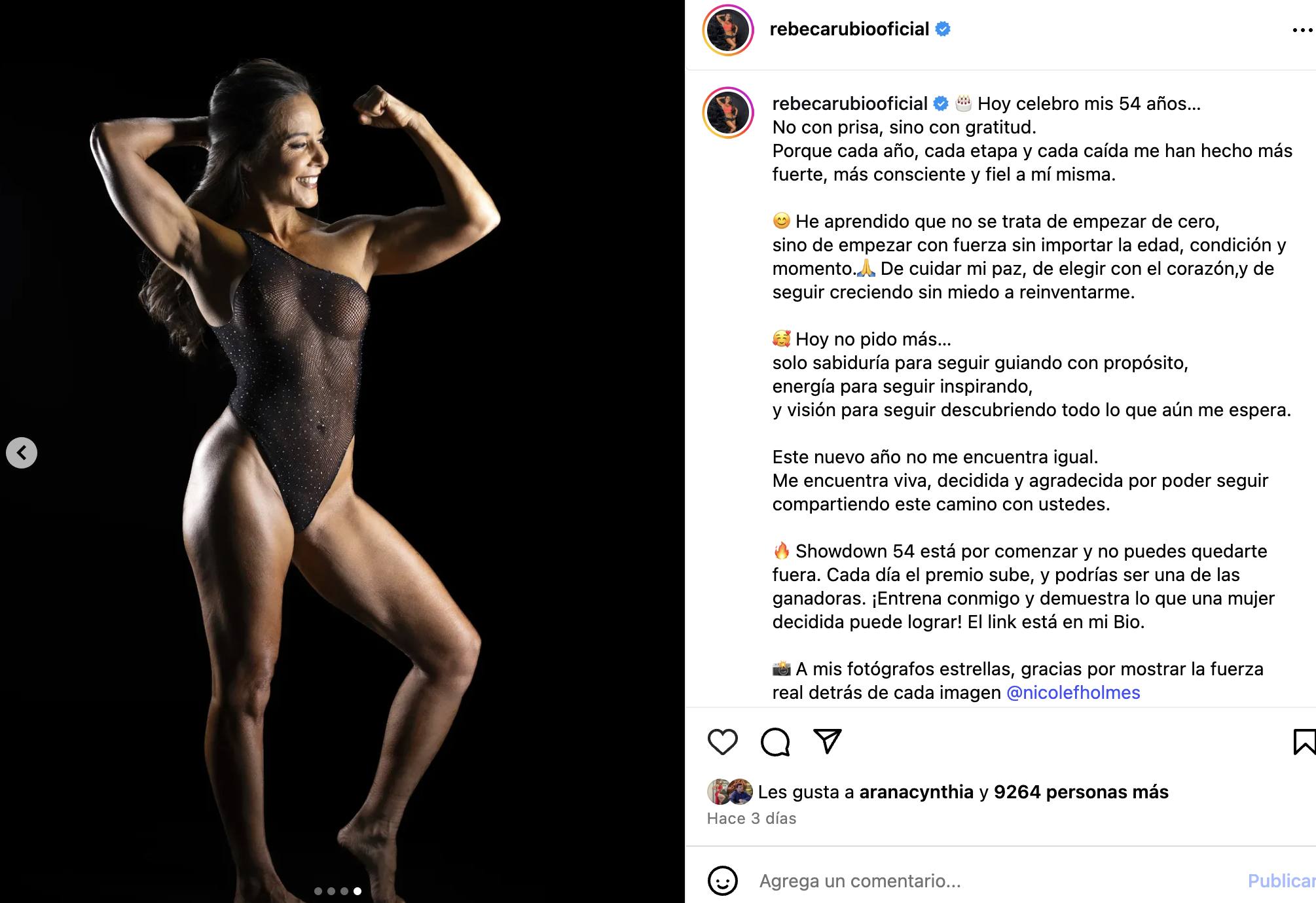 La imagen fue recibida con asombro por sus seguidores, muchos destacando el atrevimiento, la valentía y el trabajo constante que hay detrás de ese físico. A los 54, Rebeca Rubio prueba que el tiempo no es límite cuando hay pasión, disciplina y constancia.