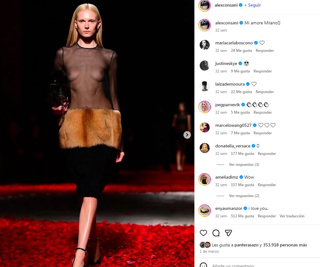 En la edición 2025 del show, Consani llamó la atención tanto por su presencia como por su actitud. Según Harper’s Bazaar, fue considerada un "showstopper" al caminar con alas metálicas, pantalones con detalles atrevidos y una combinación de piezas rojas y plateadas que destacaban su estilo personal.