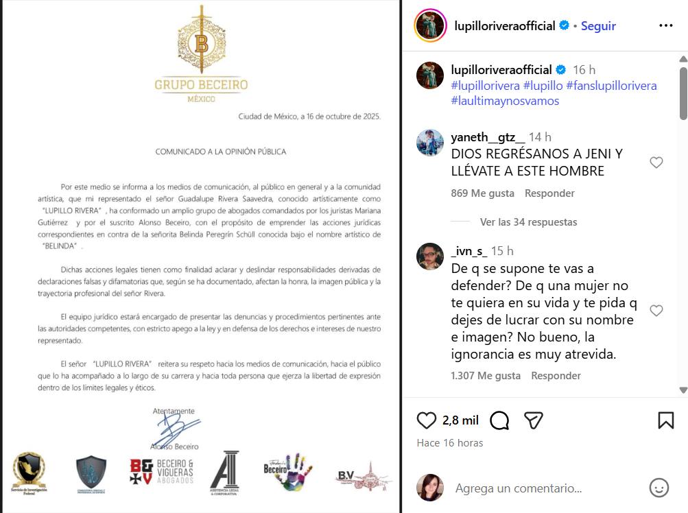 "El señor Guadalupe Rivera Saavedra, conocido artísticamente como ‘LUPILLO RIVERA’, ha conformado un amplio grupo de abogados (...) con el propósito de emprender las acciones jurídicas correspondientes en contra de la señorita Belinda Peregrín Schull, conocida bajo el nombre artístico de ‘BELINDA’", explica el texto.