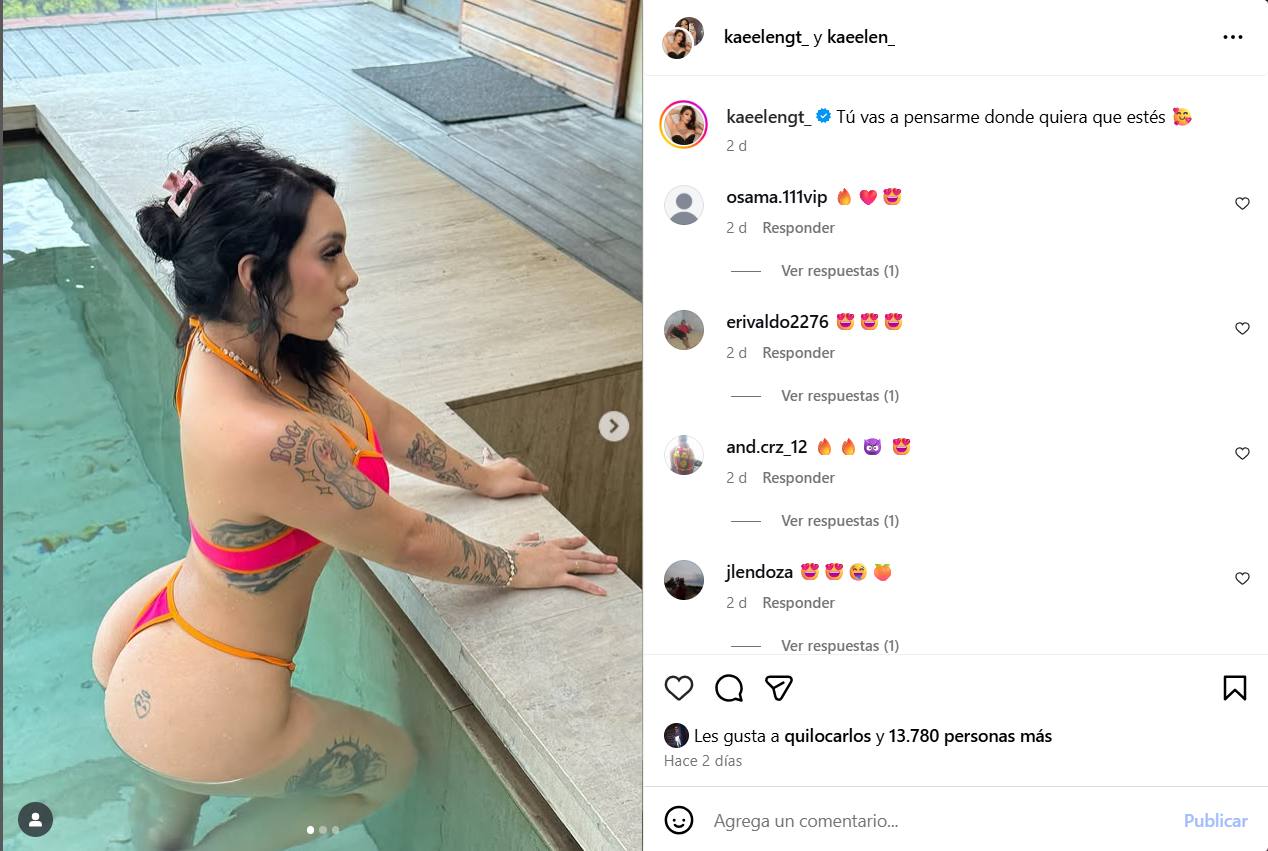 A través de su página de Instagram, Kaeelen García compartió unas candentes imágenes en la que aparece dentro de una piscina presumiendo sus curvas en sexy y diminuto bikini de hilo.