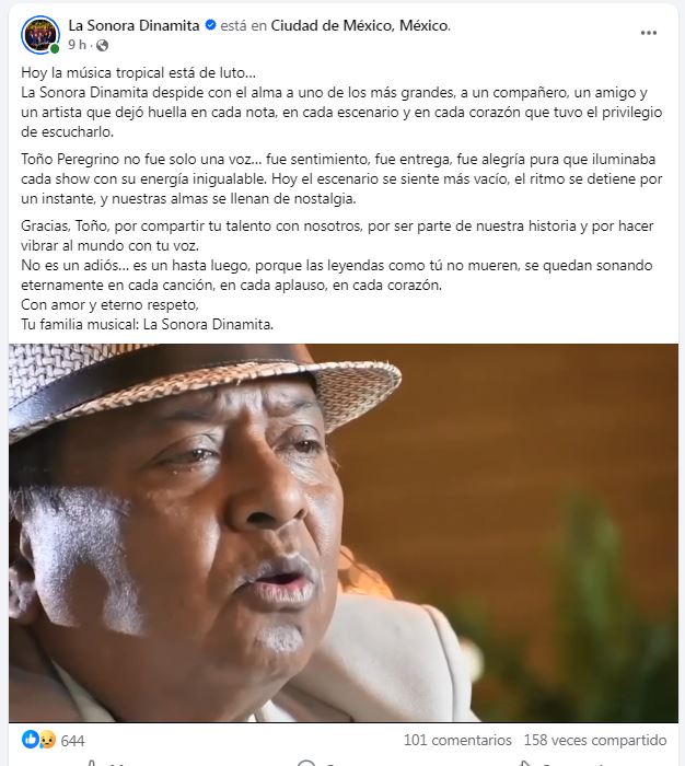 "Hoy la música tropical está de luto... La Sonora Dinamita despide con el alma a uno de los más grandes, a un compañero, un amigo y un artista que dejó huella en cada nota, en cada escenario y en cada corazón que tuvo el privilegio de escucharlo", escribió la agrupación en su publicación, acompañada por un video homenaje al cantante.