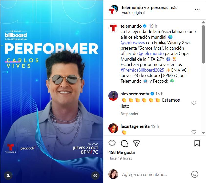 Telemundo anunció una colaboración especial con Carlos Vives, Emilia, Wisin y Xavi para la creación de la canción oficial de la cadena para la Copa Mundial de la FIFA 26, que se estrenará durante los Premios Billboard de la Música Latina 2025.