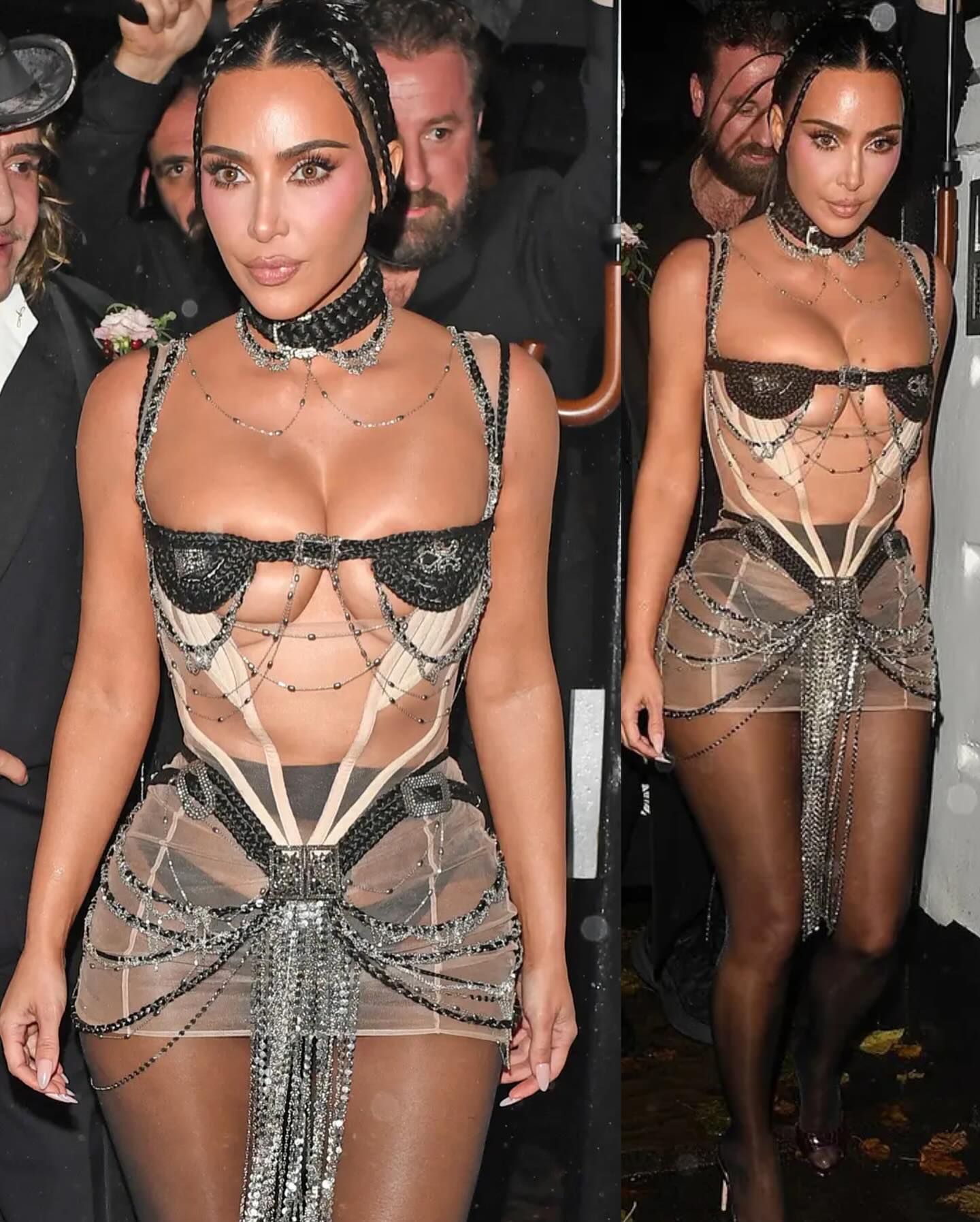 Kim Kardashian lució un minivestido ajustado con corsé, una falda transparente, detalles de hebillas occidentales y una borla de cadena colgando del frente, y un sujetador apenas visible hecho de cabello trenzado falso, todo adornado con cuentas plateadas y cristales.