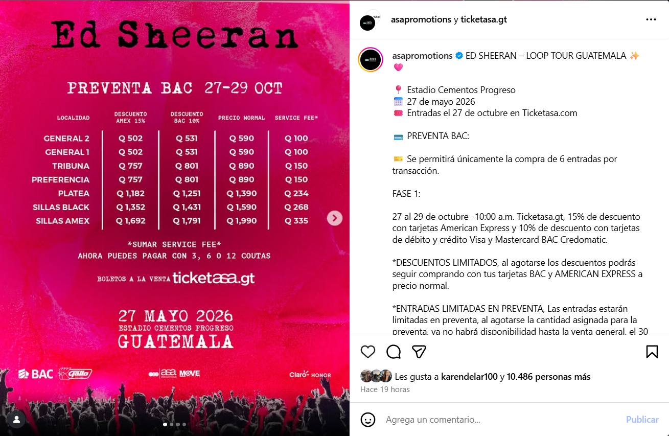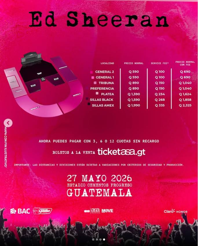 La preventa arrancará el 27 de octubre de este año y la venta general se iniciará el 30 de octubre a través de los sitios web ticketasa.gt y edsheeran.com.