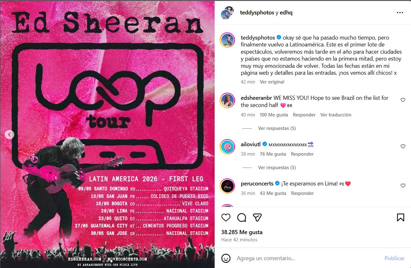 Ed Sheeran visitará por primera vez el próximo 27 de mayo de 2026 como parte de su gira "Loop Tour", así lo anunció él mismo a través de sus redes sociales.