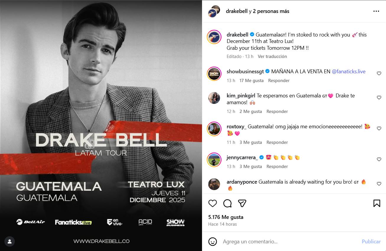 El actor y cantante estadounidense Drake Bell confirmó su primer concierto en Guatemala, programado para el jueves 11 de diciembre de 2025, en el recinto Teatro Lux, ubicado en la 6ª Avenida 11-02, Zona 1 de la capital.