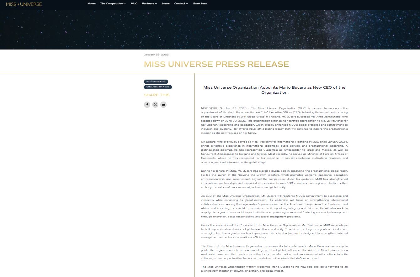 La Organización Miss Universe (MUO) abrió un nuevo capítulo en su historia al confirmar oficialmente que Mario Búcaro, reconocido diplomático y exministro guatemalteco, asume el cargo de director ejecutivo (CEO) de la franquicia global.
