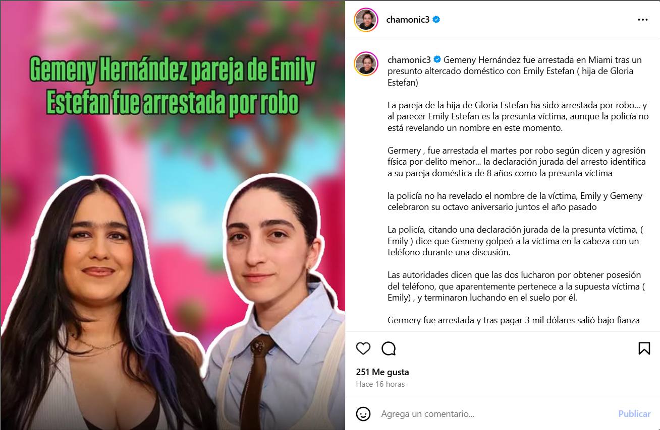 Gemeny Hernández, quien mantiene una relación con Emily Estefan desde hace varios años, fue arrestada el martes por cargos de robo con fuerza y agresión, según documentos oficiales del Departamento de Policía.