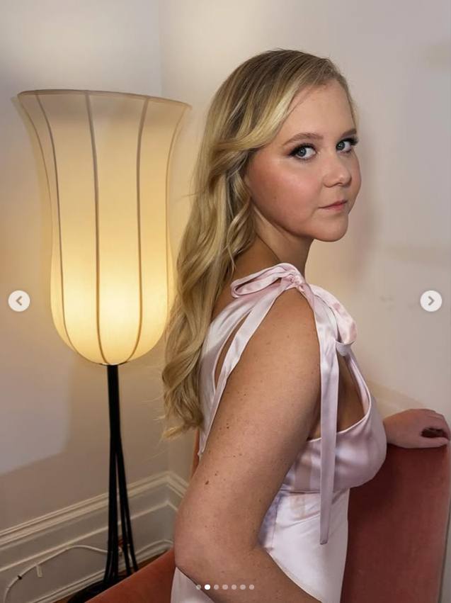 En las imágenes publicadas, Amy Schumer posó en diferentes atuendos: primero con un vestido de seda rosa y luego con un conjunto blanco y negro con un escote pronunciado, con el que lució unas piernas notablemente más delgadas.