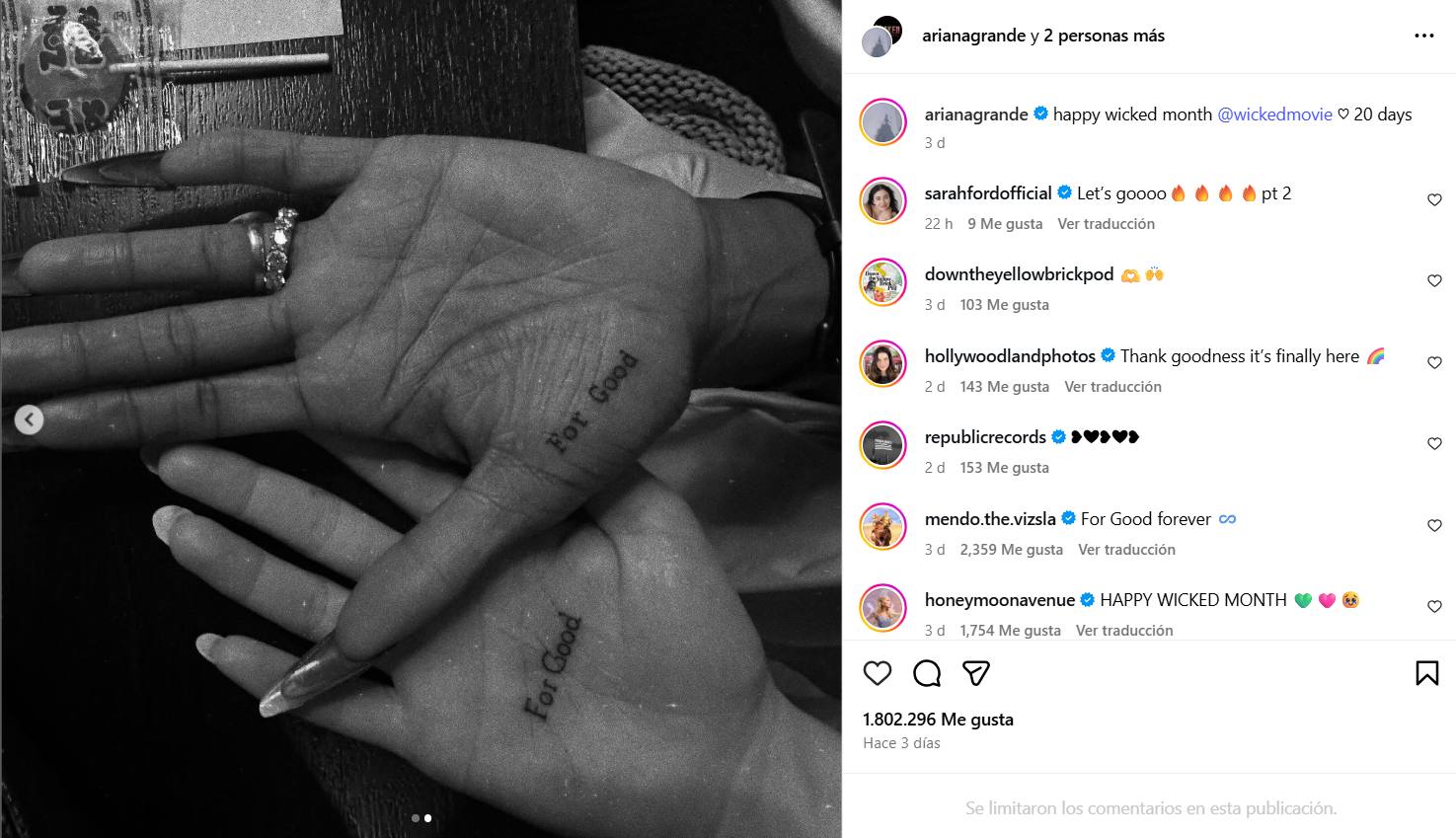 En una publicación de Instagram compartida entre ambas, Ariana Grande escribió que está contando los días para que la continuación de esta mágica historia llegue a la gran pantalla.