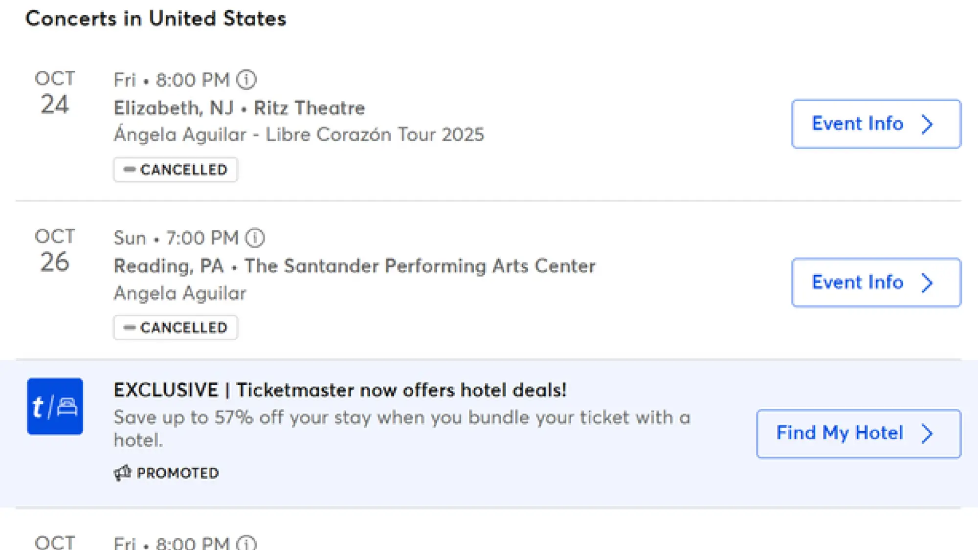 Hace un par de meses, se reveló que Ángela Aguilar tuvo que cancelar 6 de sus presentaciones en Estados Unidos. Las ciudades que se vieron afectadas son: Pensilvania, Nueva Jersey, Misuri, Oklahoma, Carolina del Norte y Nuevo México.