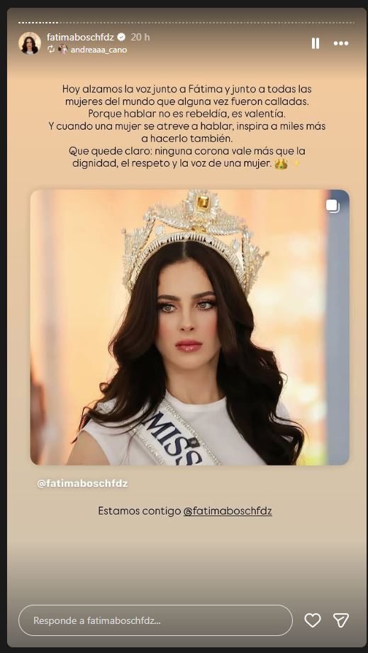 Fátima Bosch, Miss Universe México 2025, emitió un breve mensaje tras el altercado en el que reafirmó su compromiso con el certamen y declaró: "Estoy aquí más fuerte que nunca... vine aquí a ser una voz para todas las mujeres y niñas que luchan por causas". La respuesta de la comunidad mexicana fue abundante en apoyo y reconocimiento hacia su actitud frente a la situación.