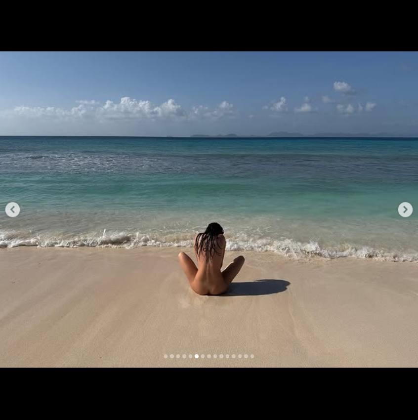 En una de las fotografías, la top model aparece recostada sobre la arena en topless solo cubierta por granos de arena sobre el pecho. En otra toma, posó con una toalla enrollada en la cintura mientras tomaba selfies frente al espejo.