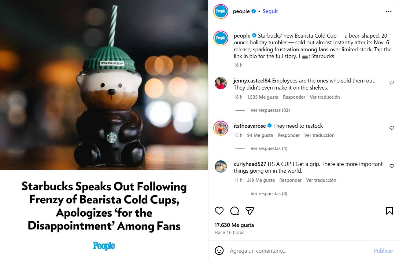 "El entusiasmo por nuestros productos superó incluso nuestras mayores expectativas", declaró Starbucks a la revista People en un comunicado del 6 de noviembre. "A pesar de haber enviado más vasos Bearista a las cafeterías que casi cualquier otro artículo durante esta temporada navideña, el vaso Bearista y algunos otros productos se agotaron rápidamente".