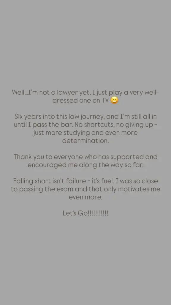 "Bueno... aún no soy abogada, solo interpreto a una muy bien vestida en la televisión", escribió. "Llevo seis años en este camino del derecho y sigo con todo hasta aprobar el examen de abogacía. Sin atajos, sin rendirme: solo más estudio y aún más determinación".