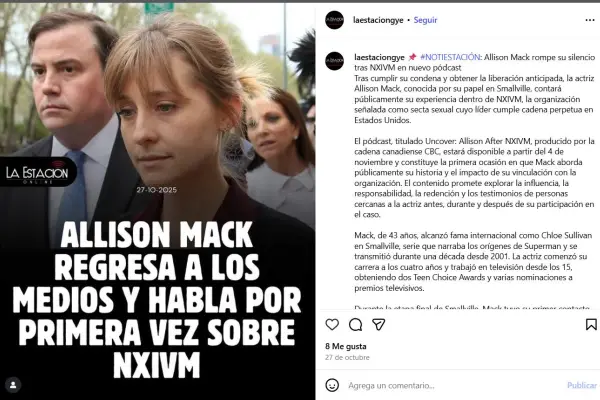 Allison Mack cumplió una condena de tres años tras declararse culpable de delitos relacionados con crimen organizado y conspiración, en un caso que generó atención internacional en 2018.
