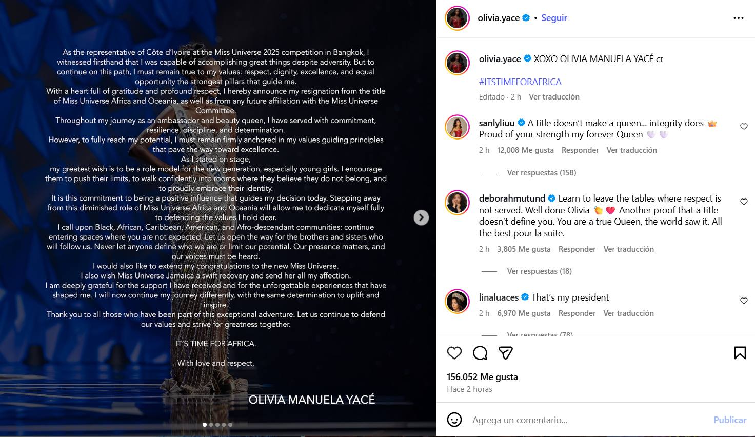 Olivia Yacé, representante de Costa de Marfil en Miss Universo 2025 celebrado en Tailandia, sorprendió este lunes al anunciar su renuncia al título de Miss Universe África y Oceanía y a cualquier futura vinculación con el Comité de Miss Universe.