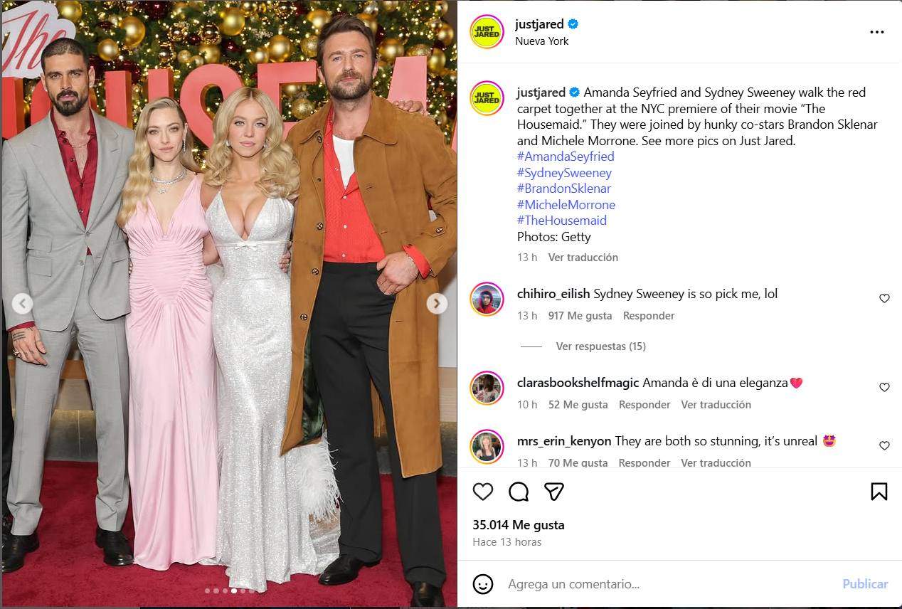 La actriz también fue fotografiada junto a su coprotagonista de "Housemaid", Amanda Seyfried, quien lució un vestido rosa de Versace de Dario Vitale con atrevidos collares de diamantes y pendientes a juego de Tiffany & Co.