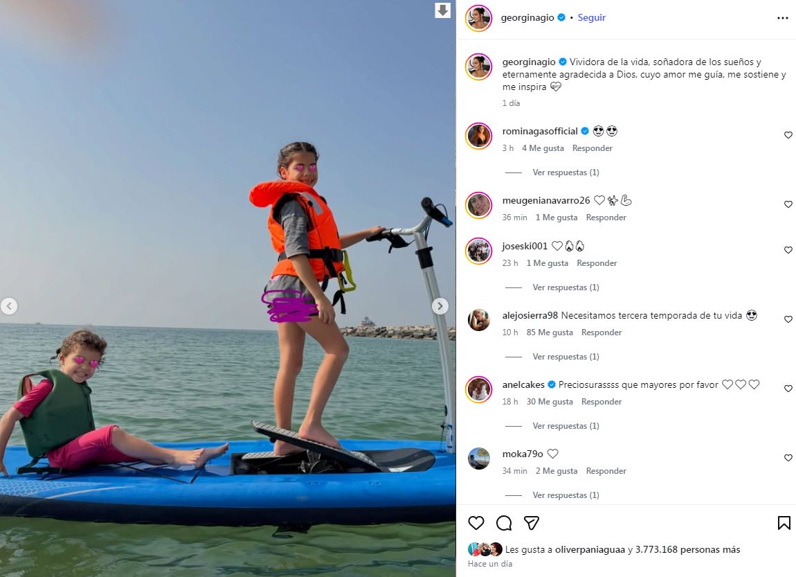 Aunque la imagen del bikini acaparó la conversación en redes, el resto del carrete mostró una faceta más íntima y maternal de Georgina Rodríguez. En las fotos siguientes, la influencer compartió escenas cotidianas de sus hijos: Mateo Ronaldo, de 8 años, disfrutando de un refrigerio junto al mar. Los mellizos Mateo y Eva María, sonrientes y llenos de energía, practicando actividades acuáticas. Alana Martina y Eva María, en momentos tranquilos dentro de casa, demostrando la cercanía entre hermanas.