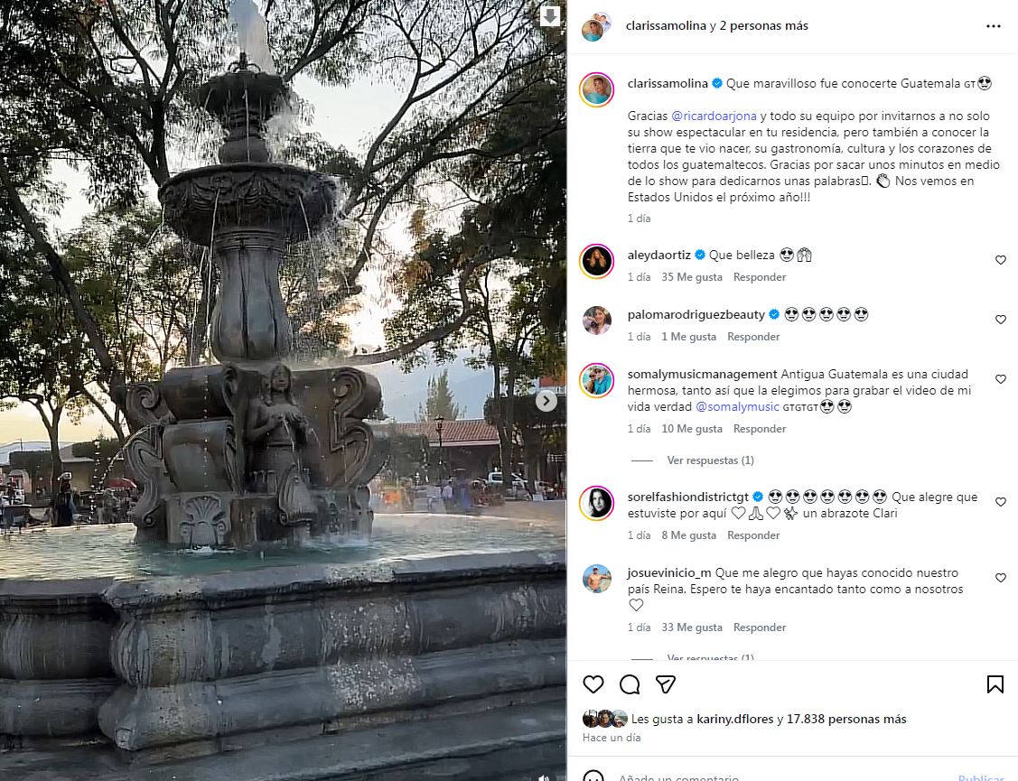Durante su estadía, Clarissa Molina aprovechó para recorrer lugares emblemáticos de Guatemala. En declaraciones para "El Gordo y la Flaca", confesó que quedó "encantada con el país", destacando su riqueza cultural, la diversidad de sus tradiciones y su exquisita gastronomía: "un país lleno de cultura, de comida espectacular, con más de 18 culturas dentro del país".