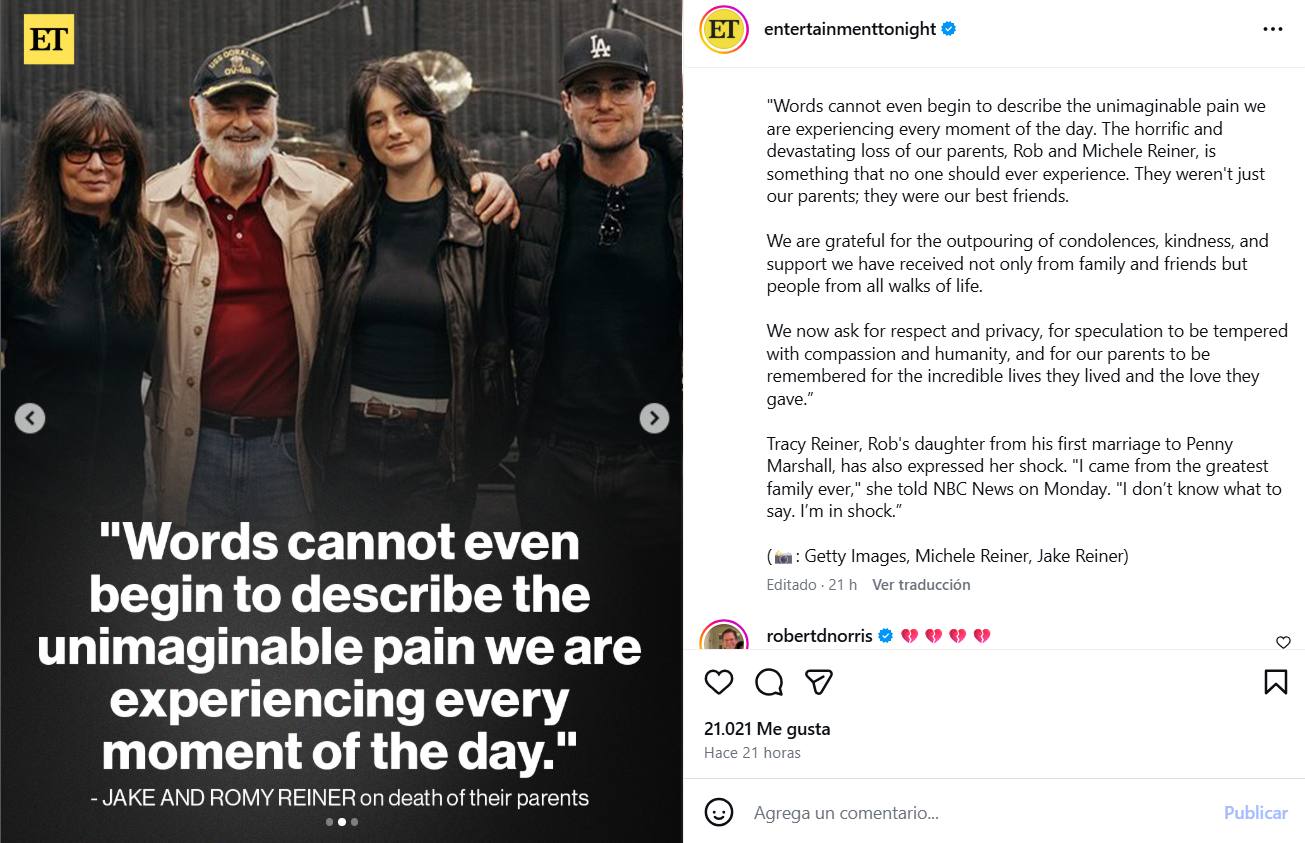 "Las palabras no alcanzan para describir el dolor inimaginable que sentimos a cada instante. La terrible y devastadora pérdida de nuestros padres, Rob y Michele Reiner, es algo que nadie debería experimentar jamás. No eran solo nuestros padres; eran nuestros mejores amigos", indicaron en un escrito compartido al medio TMZ.