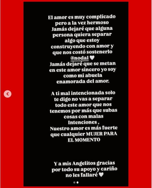 Y luego añadió: "A ti mal intencionada solo te digo que no vas a separar todo este amor que nos tenemos por más que subas cosas con malas intenciones. Nuestro amor es más fuerte que cualquier MUJER PARA EL MOMENTO".