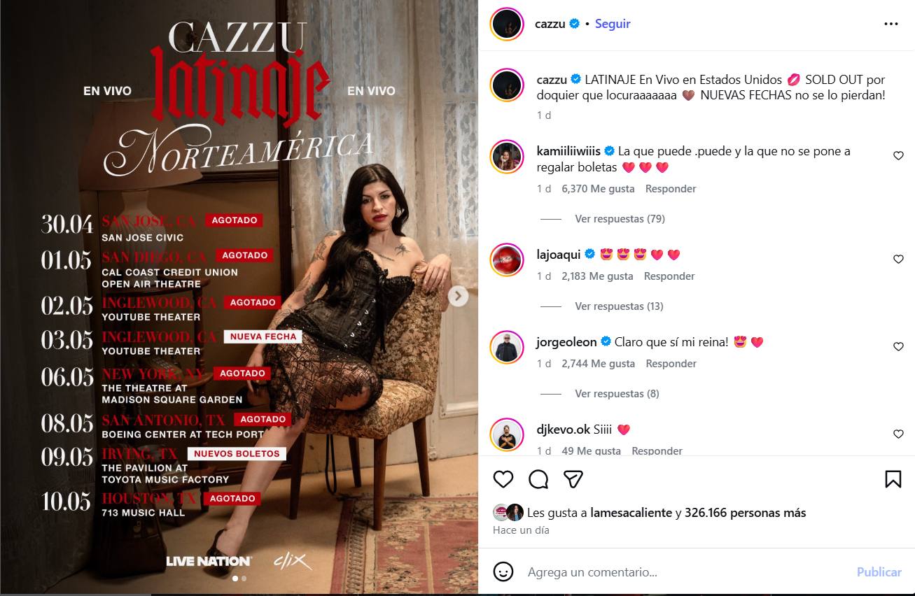 Cazzu celebró un logro importante en su carrera al agotar entradas en seis conciertos de su próxima gira "Latinaje" por Estados Unidos, prevista para la primavera de 2026.