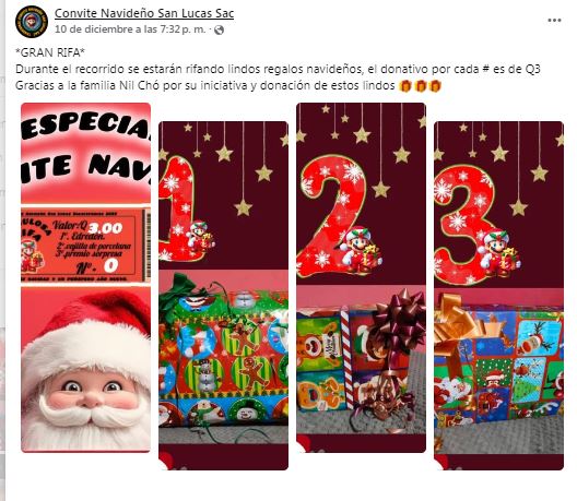 Además del desfile y la música, el Convite Navideño 2025 incluirá la rifa de regalos navideños durante el recorrido. Los números tendrán un costo de Q3.00 y podrán adquirirse escribiendo directamente a las redes sociales de los organizadores. Esta dinámica busca fomentar la participación de la comunidad y sumar un toque especial de emoción a la actividad.