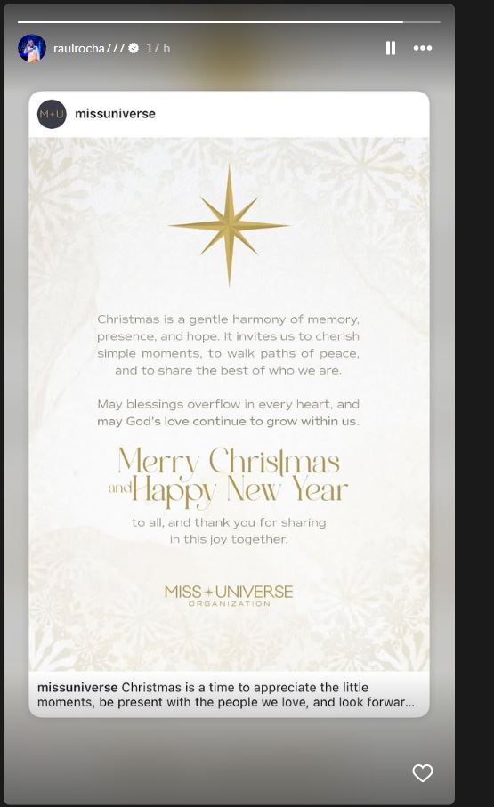 El mensaje difundido a través de la cuenta oficial de Miss Universe invitó a la reflexión sobre la importancia de la paz, la esperanza y los valores familiares durante las fiestas decembrinas.