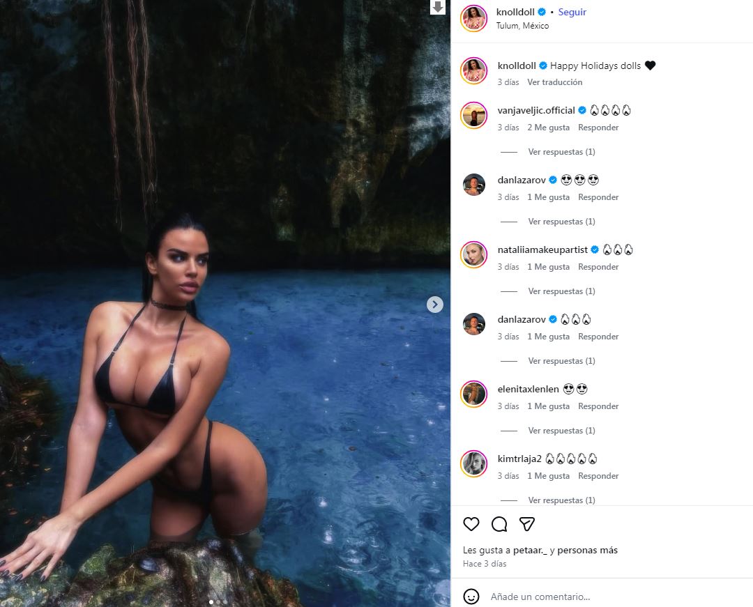 A través de su cuenta oficial de Instagram, Ivana Knoll publicó una serie de fotografías en las que aparece dentro de un cenote, luciendo un bikini negro de corte minimalista que resaltó su figura. La modelo acompañó las imágenes con un breve mensaje en inglés: "Happy Holidays dolls", junto a un emoji de corazón negro, un saludo sencillo pero suficiente para incendiar las redes sociales en plena temporada navideña.