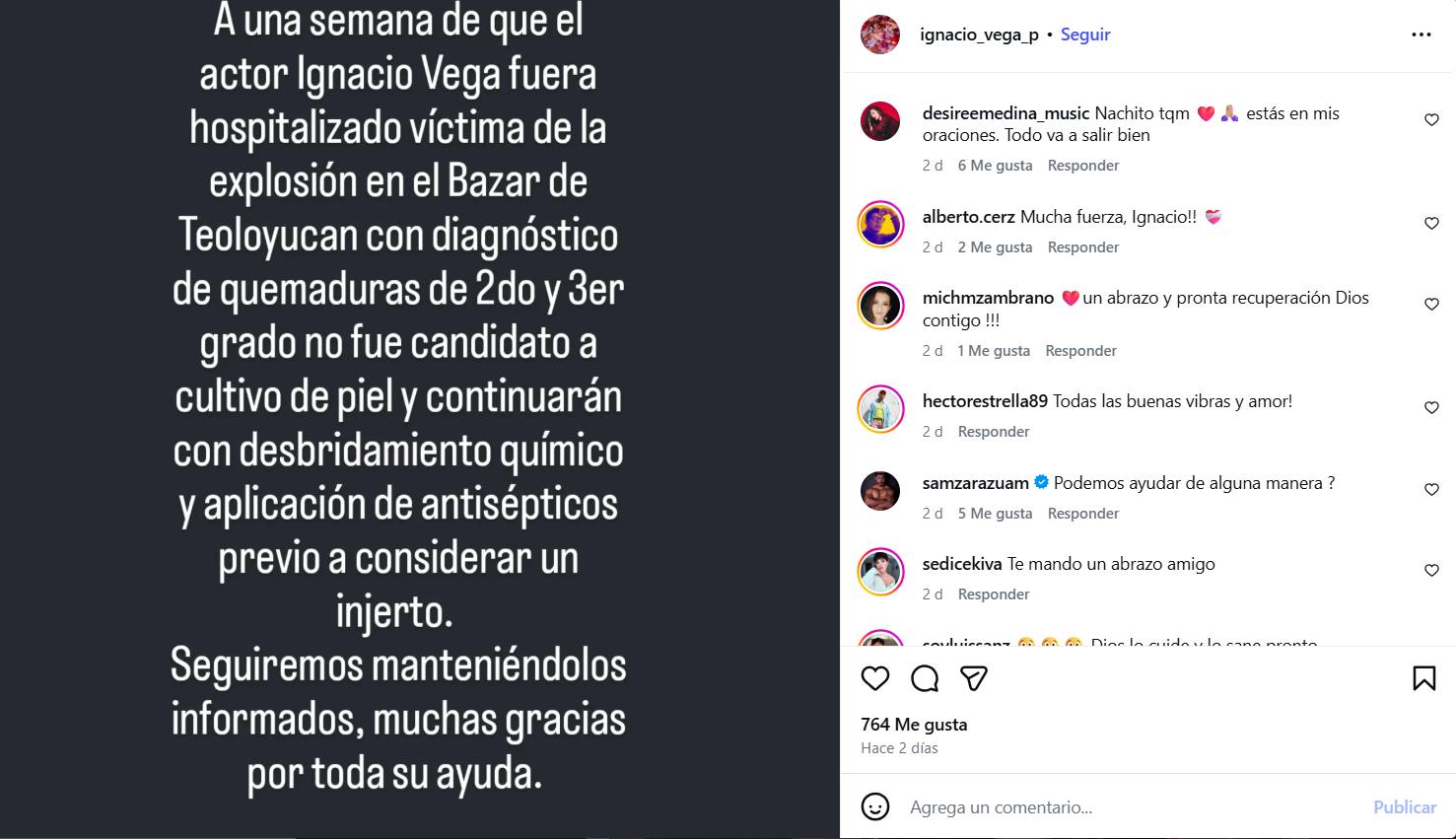 El 26 de diciembre, la cuenta oficial de Instagram de Ignacio Vega comunicó que el artista presenta quemaduras de segundo y tercer grado en brazos y rostro, por lo que su hospitalización seguirá hasta nuevo aviso.