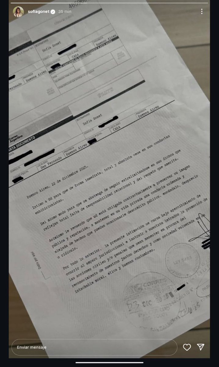 Lejos de retractarse, Sofía Gonet optó por exponer públicamente el contenido de la carta y su postura frente al incidente. La joven hizo visible la correspondencia legal que recibió tras el episodio, buscando abrir el debate sobre el derecho al cuerpo y la convivencia en espacios compartidos.