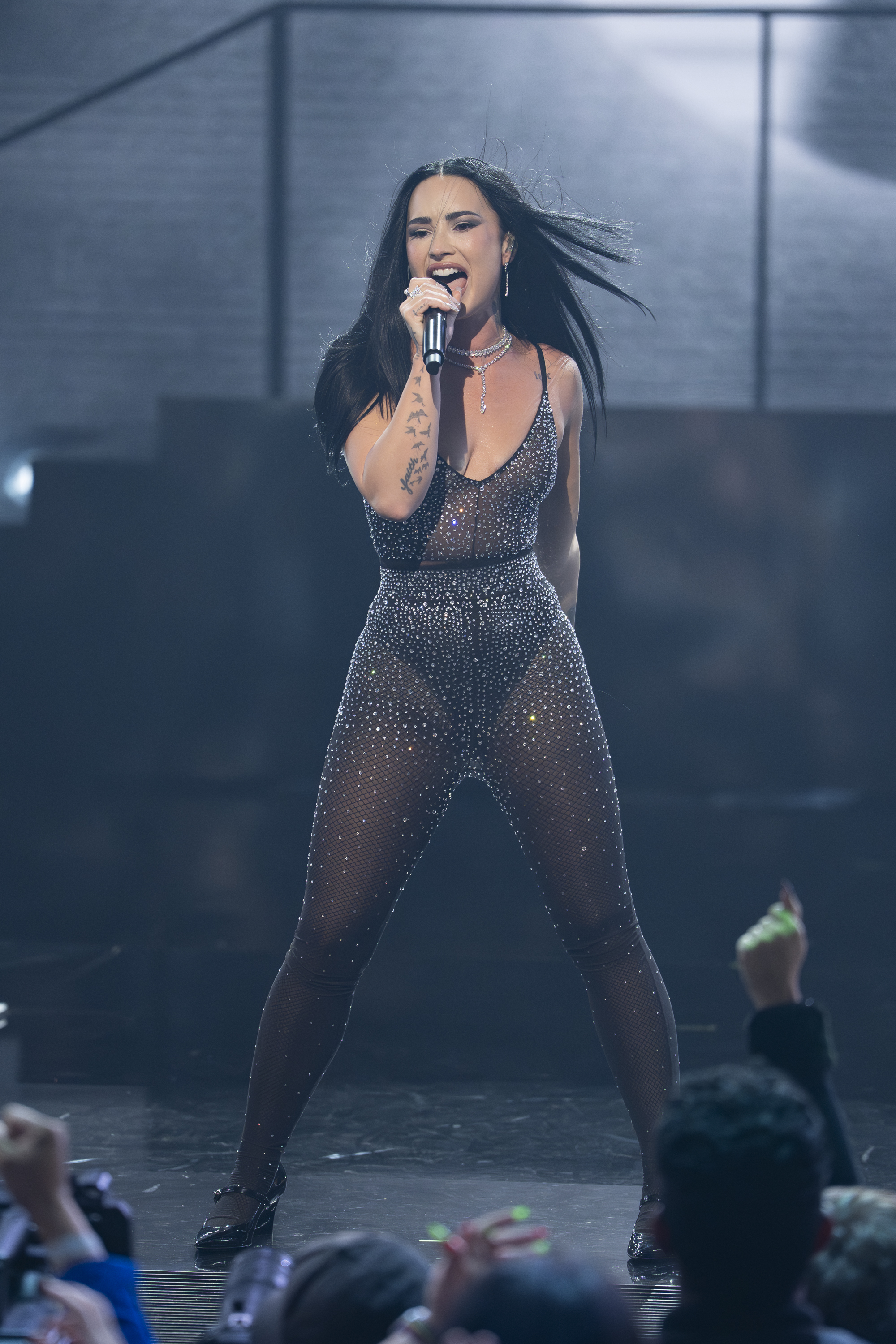Demi Lovato brilló como una de las figuras más comentadas durante la alfombra roja de Dick Clark's New Year's Rockin' Eve en Nueva York, captando la atención de todos con un arriesgado catsuit de malla transparente adornado con aplicaciones brillantes.