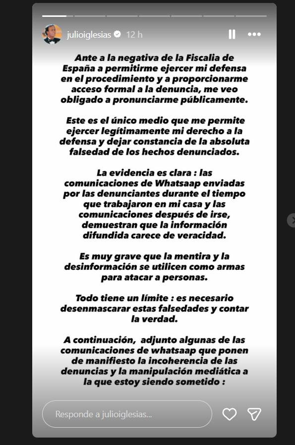 "Ante la negativa de la Fiscalía de España a permitirme ejercer mi defensa en el procedimiento y a proporcionarme acceso formal a la denuncia, me veo obligado a pronunciarme públicamente. Este es el único medio que me permite ejercer legítimamente mi derecho a la defensa y dejar constancia de la absoluta falsedad de los hechos denunciados", expresó el cantante.