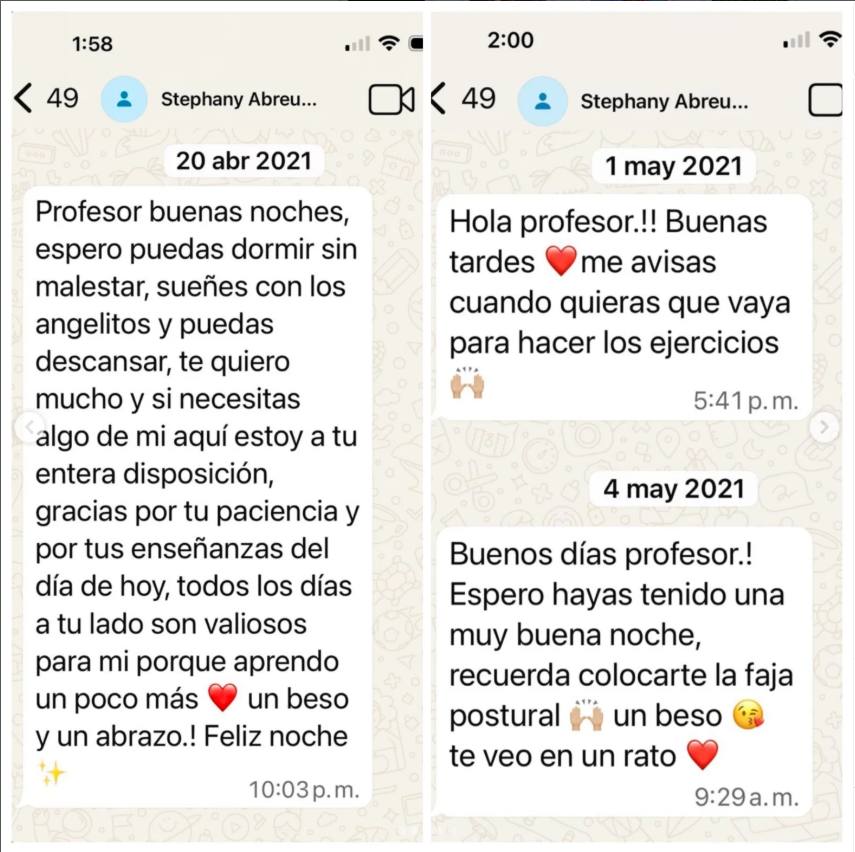 Las capturas compartidas muestran conversaciones de 2021. Una mujer identificada como Stephany Abreu le escribe: "Profesor buenas noches, espero puedas dormir sin malestar, sueñes con los angelitos y puedas descansar, te quiero mucho... gracias por tu paciencia y por tus enseñanzas del día de hoy".