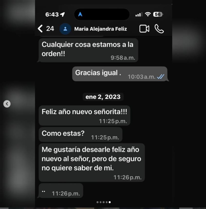 En otra serie de mensajes, una mujer identificada como María Alejandra le envía saludos afectuosos en 2023, le dice que lo quiere mucho y que está "a la orden". Incluso aparece un mensaje donde ella misma reconoce: "Me gustaría desearle feliz año nuevo al señor, pero de seguro no quiere saber de mí".