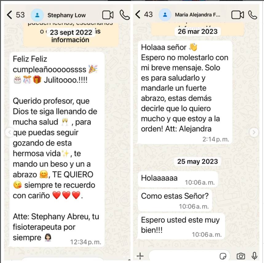 También difundió una felicitación de cumpleaños de septiembre de 2022 donde la mujer lo llama "Julitoooo" y le desea salud y felicidad, firmando como "tu fisioterapeuta por siempre".