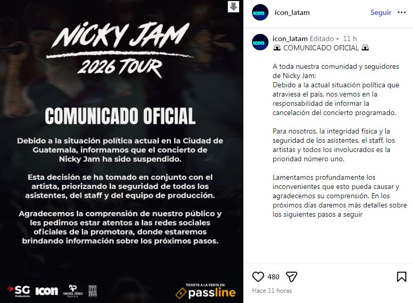 De acuerdo con la información compartida, la decisión se tomó debido a la situación política actual en la Ciudad de Guatemala, priorizando la seguridad de todos los involucrados. En el mensaje, la organización explicó que la cancelación se realizó en conjunto con el artista, poniendo como prioridad número uno la integridad física de los asistentes, el staff, los artistas y el equipo de producción.
