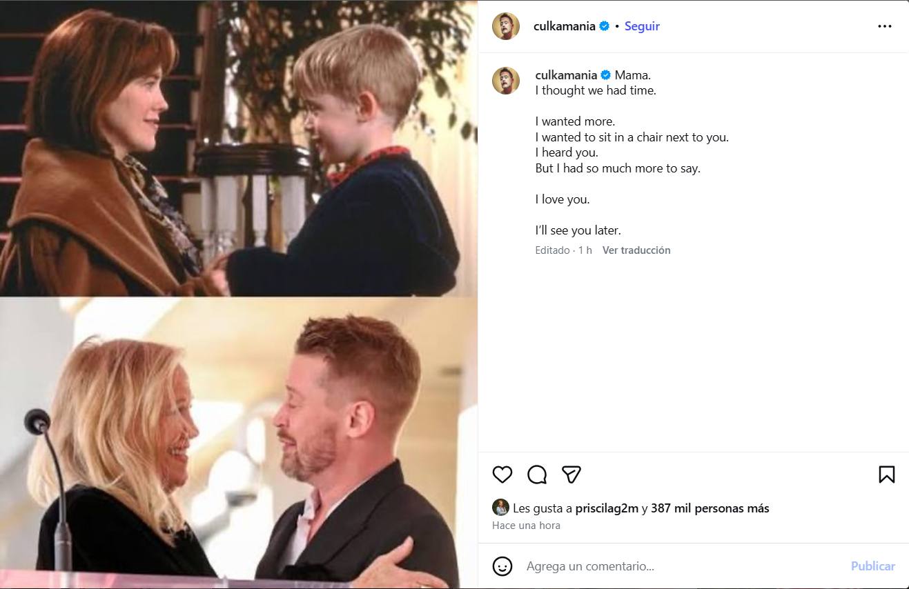 "Mamá. Pensé que teníamos tiempo", escribió Culkin en una publicación acompañada de un sentido mensaje: "Quería más. Quería sentarme en una silla a tu lado. Te escuché, pero tenía mucho más que decir. Te quiero. Nos veremos luego".