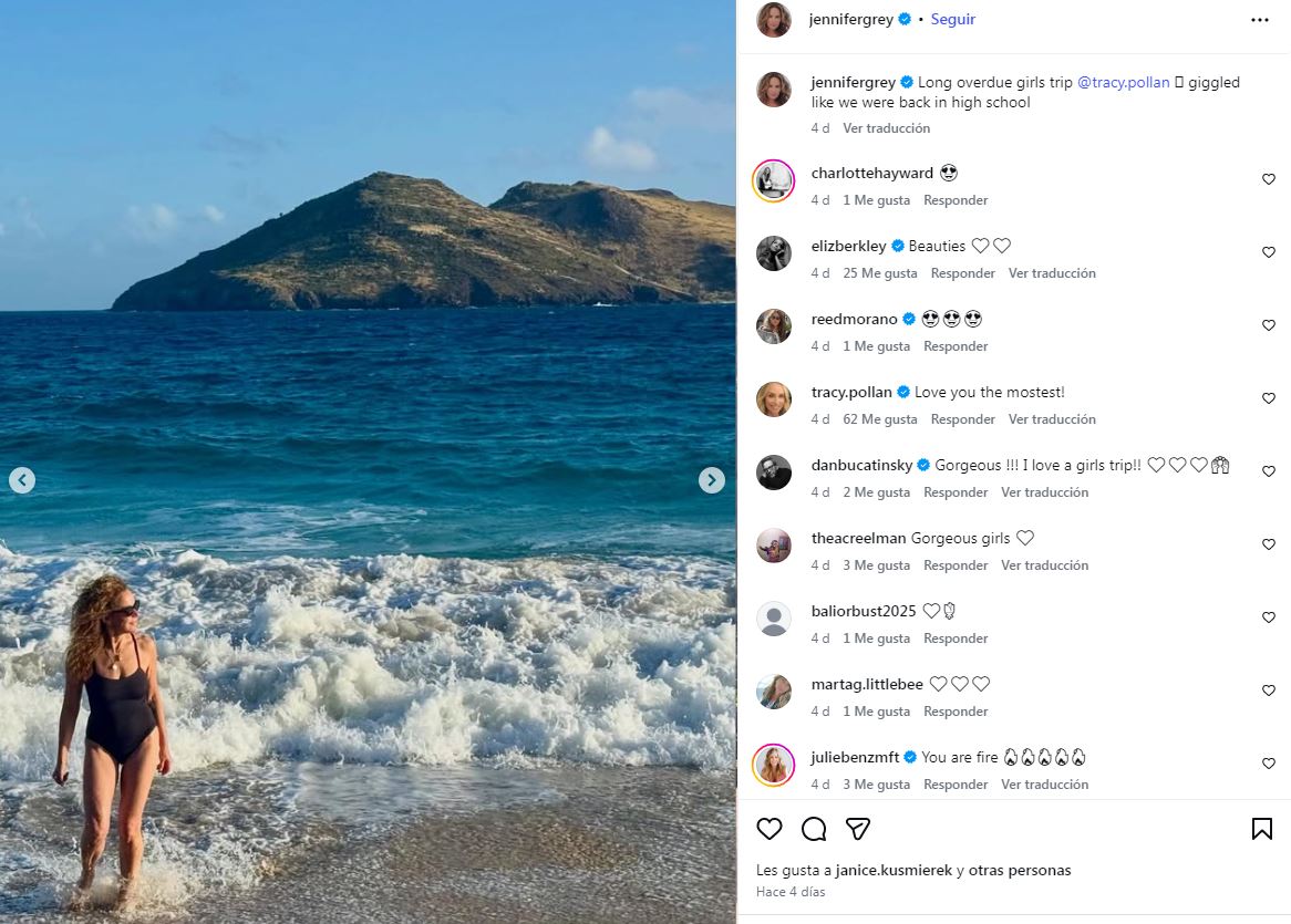 Las imágenes que compartió recientemente muestran a Jennifer Grey en un destino paradisíaco, posando en traje de baño y disfrutando de un viaje con amigas. En una de las fotografías aparece con un bikini negro y sombrero de playa, mientras que en otra se la ve caminando junto al mar con un traje de baño enterizo oscuro. Las publicaciones rápidamente se volvieron virales entre sus seguidores.