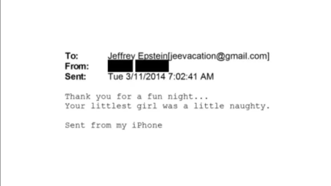 En un correo electrónico de 2014, un remitente cuyo nombre está censurado le envió a Jeffrey Epstein: "Gracias por una noche divertida... Tu niña más pequeña era un poco traviesa".