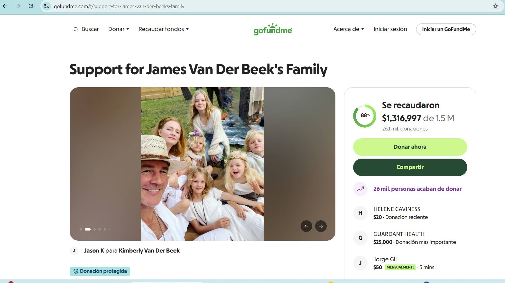 En cuestión de horas, la campaña logró el 91% de su objetivo, acumulando más de 1.3 millones de dólares gracias a más de 22,000 donaciones. Kimberly Van Der Beek compartió el enlace en sus historias de Instagram, expresando su agradecimiento y su corazón roto.