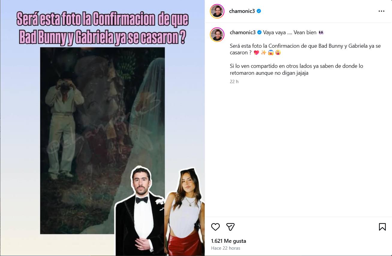 "Vaya vaya... Vean bien. ¿Será esta foto la confirmación de que Bad Bunny y Gabriela ya se casaron?", escribió la comunicadora.