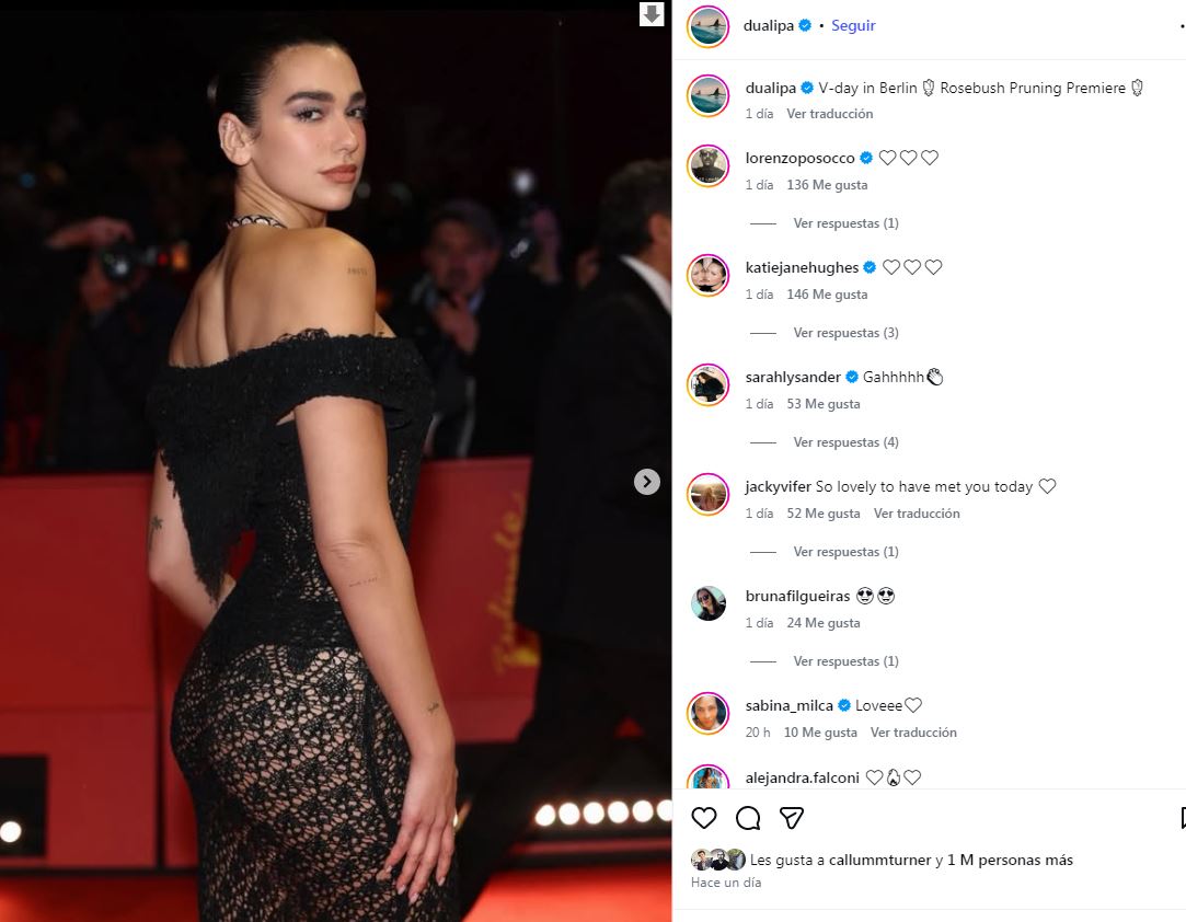 La cantante británica Dua Lipa se convirtió en una de las figuras más comentadas del Festival Internacional de Cine de Berlín 2026 al aparecer en la alfombra roja con un vestido negro transparente y ajustado, acompañando a su pareja, el actor Callum Turner, protagonista de la película Rosebush Pruning.