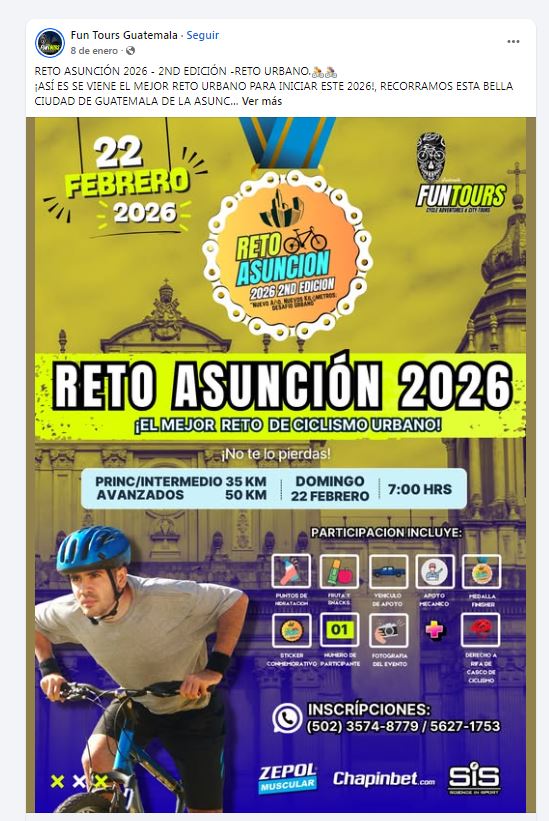 El ciclismo urbano continúa ganando popularidad en Guatemala como una alternativa saludable y recreativa para iniciar el año con energía. Por ello, Fun Tours Guatemala anunció la realización del recorrido en bicicleta 2026, también conocido como Reto Asunción, una actividad pensada para quienes desean salir de la rutina y compartir una experiencia deportiva en grupo.