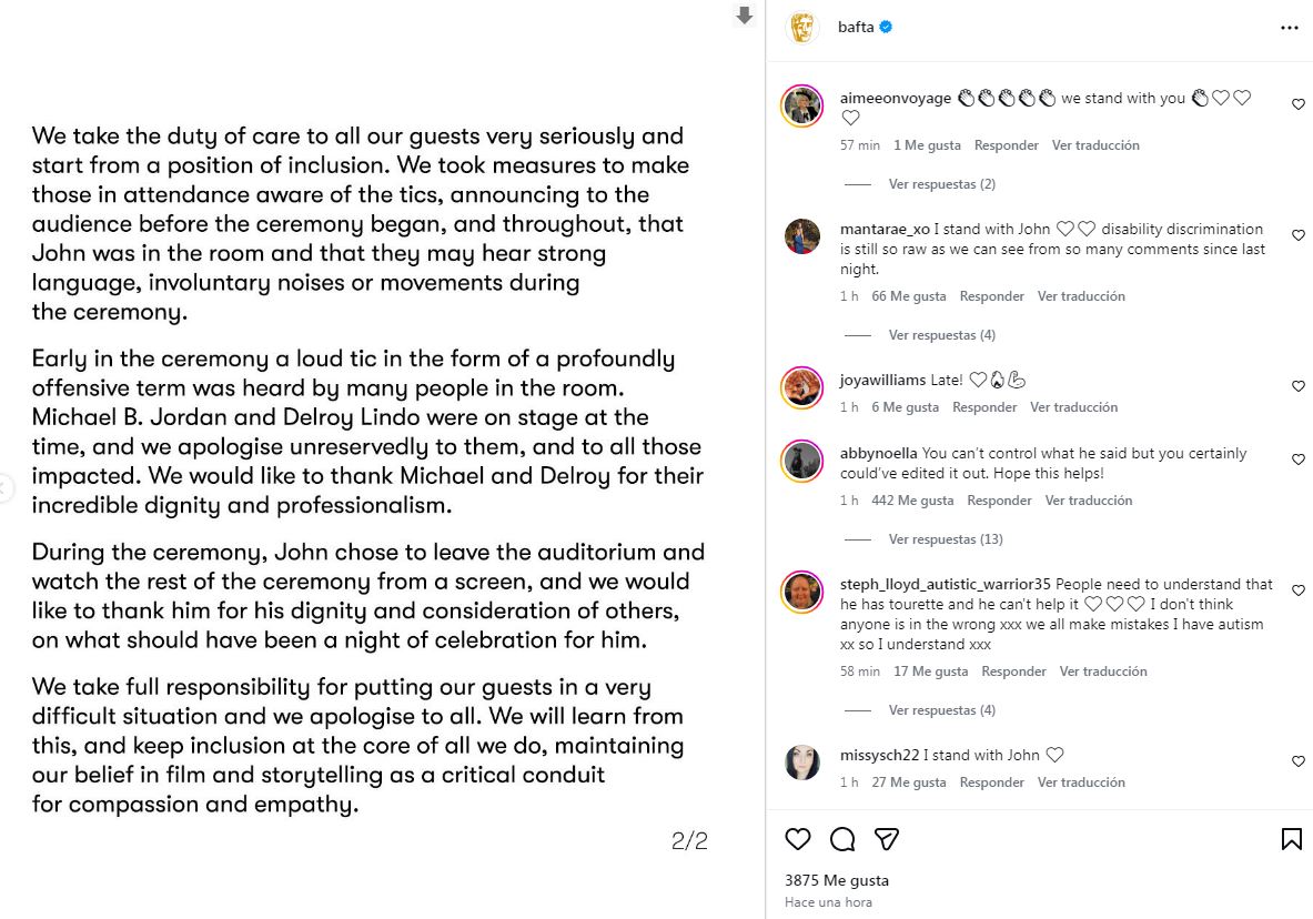BAFTA aseguró que aprenderá de lo sucedido y que mantendrá la inclusión en el centro de sus acciones. Sin embargo, el episodio ya ha dejado una huella profunda en una de las ceremonias más importantes del calendario cinematográfico internacional.