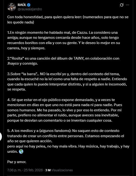 Ante el revuelo mediático, Rauw Alejandro decidió romper el silencio. A través de un mensaje que inició con la frase "Con toda honestidad", el puertorriqueño aclaró varios puntos y marcó distancia respecto a la polémica.