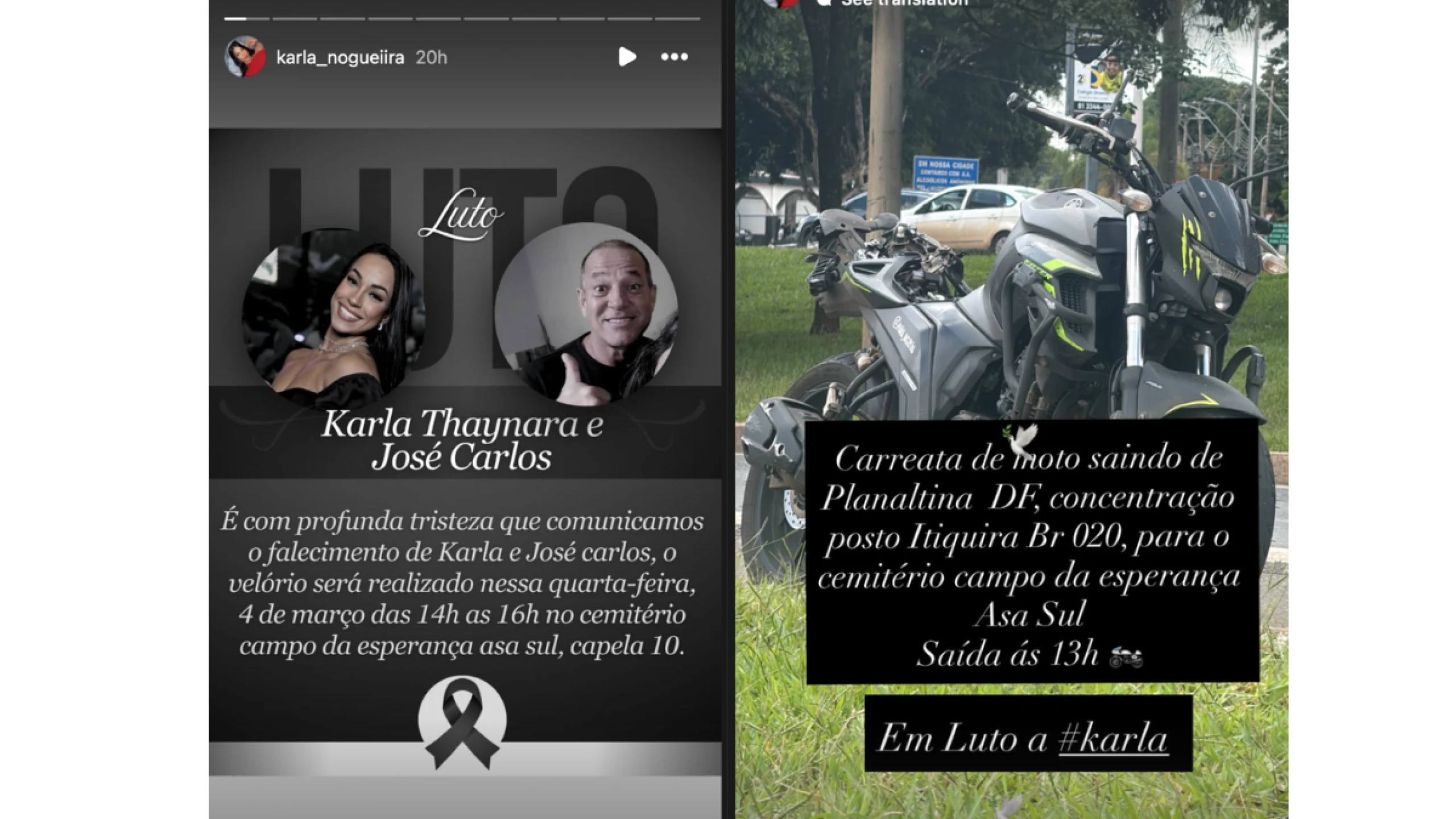 "Con profunda tristeza anunciamos el fallecimiento de Karla y José Carlos. El velatorio se realizará este miércoles 4 de marzo, de 14:00 a 16:00 h, en el cementerio Campo da Esperança, Asa Sul, capilla 10".