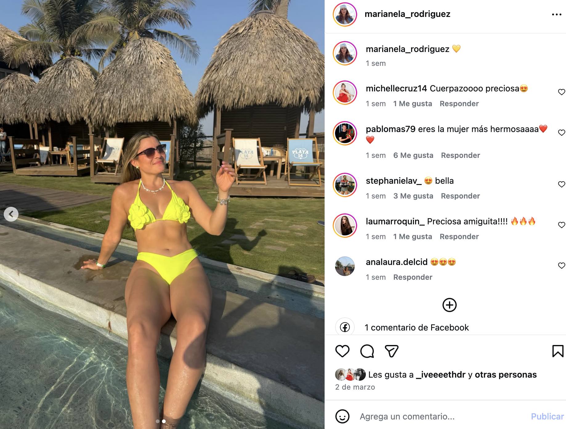 En las imágenes, Marinela Rodríguez aparece disfrutando de un momento relajado mientras modela un bikini de color amarillo que resaltó su estilo y personalidad frente a la cámara. La publicación no tardó en generar reacciones entre sus seguidores, quienes inundaron la sección de comentarios con elogios y mensajes positivos.