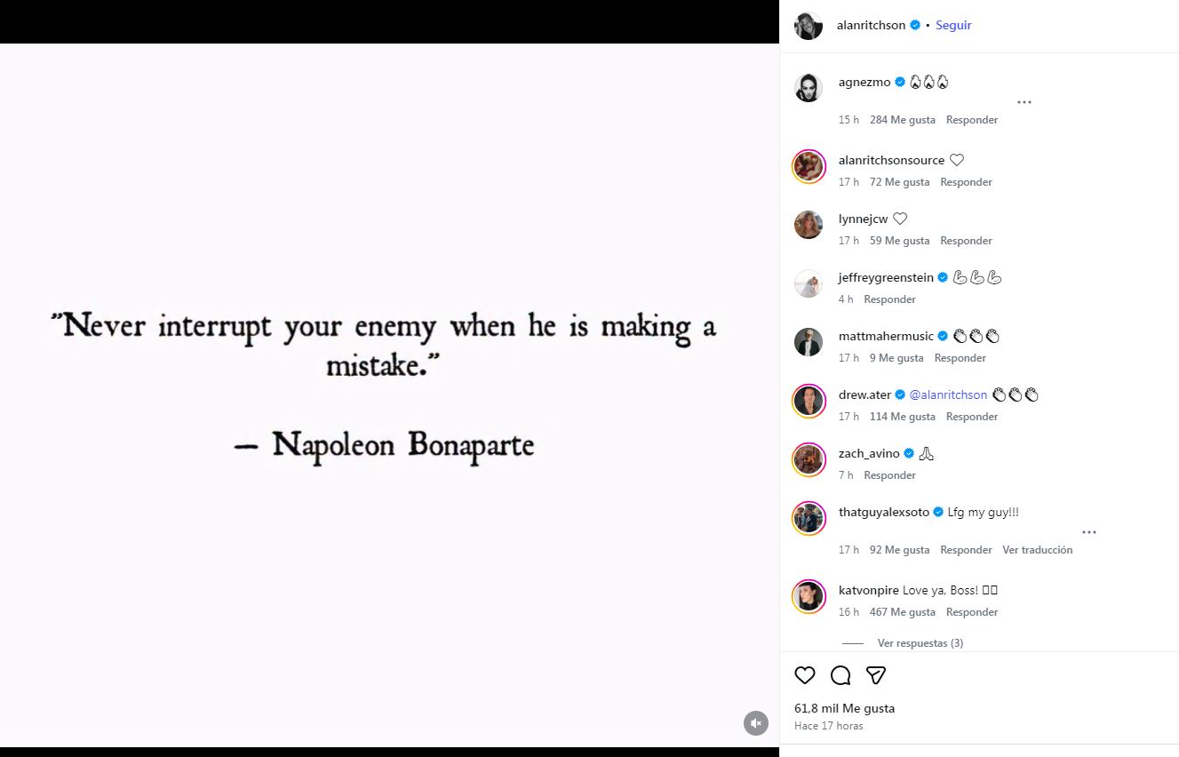 Horas después del incidente, Ritchson publicó en su cuenta de Instagram una reflexión que generó nuevas críticas. El actor citó una frase atribuida al líder francés Napoleón Bonaparte: "Nunca interrumpas a tu enemigo cuando esté cometiendo un error".